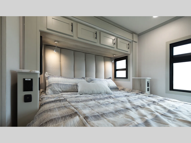 You will love the convenient amenities that have been included, like the multiplex wiring with a touch screen command center, the on-demand water heater, and the maintenance-free house battery with a single 200W solar panel to go off-grid when you choose. Inside, you'll find leatherette captain's seats with air ride, solid surface countertops with LED edge lighting, hardwood shaker-style cabinetry, and many more luxuries.