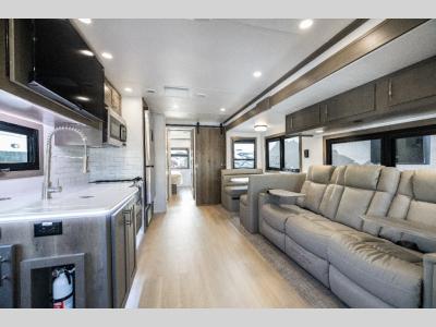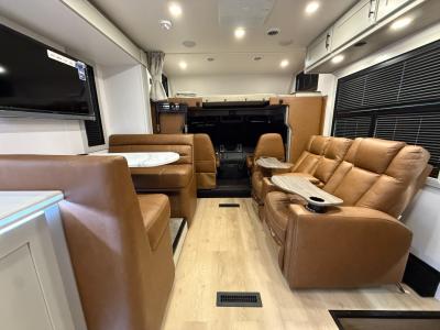 You will love the convenient amenities that have been included, like the multiplex wiring with a touch screen command center, the on-demand water heater, and the maintenance-free house battery with a single 200W solar panel to go off-grid when you choose. Inside, you'll find leatherette captain's seats with air ride, solid surface countertops with LED edge lighting, hardwood shaker-style cabinetry, and many more luxuries.