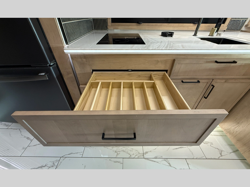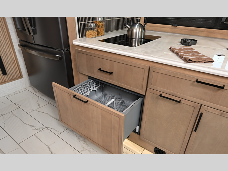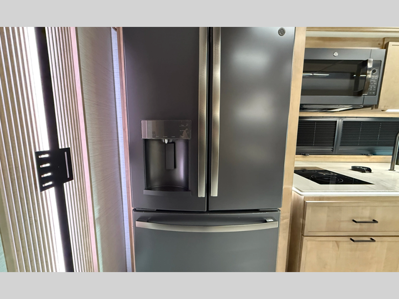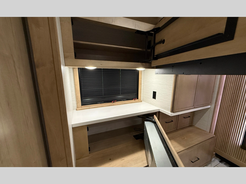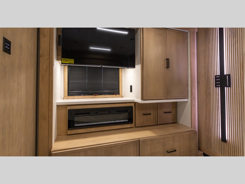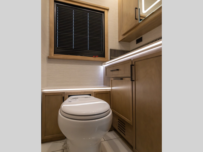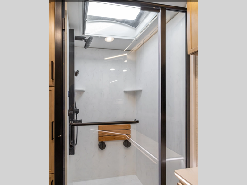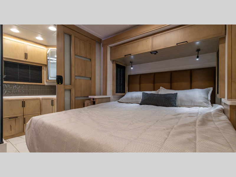 Beyond the muscle, the Grand Sport surrounds you with true residential comfort: wood-free Azdel composite sidewalls, dual-pane frameless windows, heated porcelain tile floors, and beautifully finished hardwood cabinetry create a quiet, upscale space for full-time living or extended trips. A robust solar and lithium battery setup, hydronic heat, and advanced 360° camera and infotainment tech make life on the road as easy as life at home.