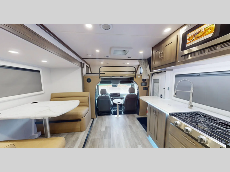 Sleeps 3 Slides 1 Length 24 ft 7 in Ext Width 7 ft 10 in Ext Height 11 ft 5 in Int Height 6 ft 9 in Interior Color Saddle, Milano II Exterior Color Full Body Paint; Magnetic, Varesine Blue, Titanium Hitch Weight 5000 lbs GVWR 11030 lbs Fresh Water Capacity 35 gals Grey Water Capacity 32 gals Black Water Capacity 32 gals Tire Size 16" Furnace BTU 20000 btu Generator Flex Power™ 4000i LP Fuel Type Diesel Engine 2.0L I-4 Chassis Mercedes Benz Sprinter Horsepower 208 hp Wheelbase 170 in Available Beds Queen Torque 332 ft-lb Refrigerator Type 12V Two Door Compressor Driven Refrigerator Size 8 cu ft Convection Cooking Yes Cooktop Burners 3 Number of Awnings 1 Axle Weight Front 4410 lbs Axle Weight Rear 7720 lbs LP Tank Capacity 20.3 gals Water Heater Type Truma Aqua Go Comfort On Demand AC BTU 15000 btu TV Info LR 32" LED Smart TV, BR 32" LED Smart TV Awning Info 16' Armless w/LED Lighting and Motion Activated Retraction Gross Combined Weight 15250 lbs Shower Type Standard Electrical Service 30 amp Similar Floorplans