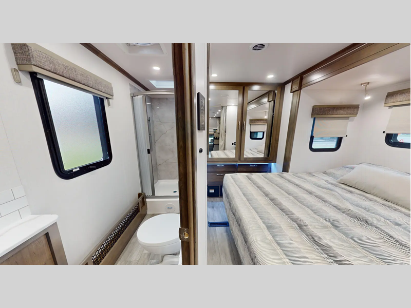 Sleeps 4 Slides 1 Length 31 ft 2 in Ext Width 8 ft Ext Height 12 ft 4 in Int Height 6 ft 10 in Interior Color Saddle, Milano II Exterior Color Optional Single Color Full Body Paint, Optional Xplorer Package Full Body Dark, Light Hitch Weight 10000 lbs GVWR 19500 lbs Fresh Water Capacity 78 gals Grey Water Capacity 45 gals Black Water Capacity 45 gals Tire Size 225/70R19.5G Furnace BTU 40000 btu Generator 8KW Onan Diesel Fuel Type Diesel Engine Cummins 6.7L I6 Turbo Chassis Ram 5500 SLT Horsepower 360 hp Fuel Capacity 52 gals Wheelbase 217 in Number Of Bunks 1 Available Beds RV Queen Torque 800 ft-lb Refrigerator Type 12V Two Door Compressor Driven Refrigerator Size 10 cu ft Convection Cooking Yes Cooktop Burners 3 Number of Awnings 1 Axle Weight Front 7250 lbs Axle Weight Rear 13500 lbs LP Tank Capacity 20.3 gals Water Heater Type Truma Aqua Go Comfort On Demand AC BTU 30000 btu TV Info LR 42" LED Smart TV, BR 32" LED Smart TV Awning Info 16' Armless w/LED Lighting and Motion Activated Retraction Gross Combined Weight 37500 lbs Shower Type Standard Electrical Service 50 amp Similar Floorplans