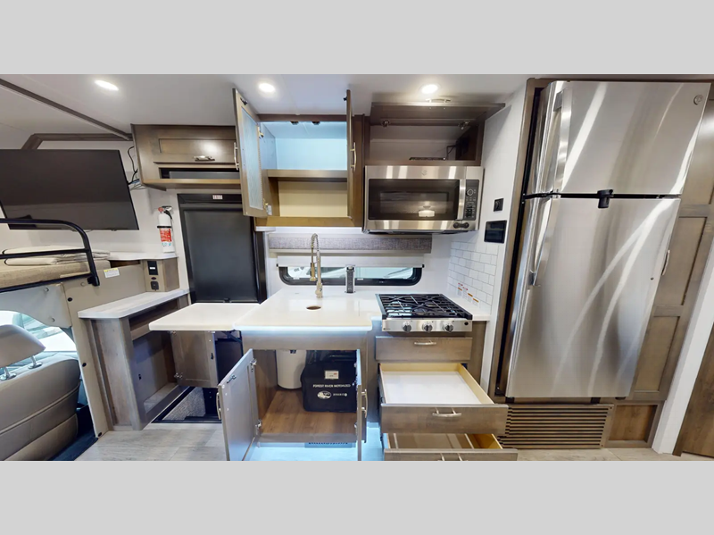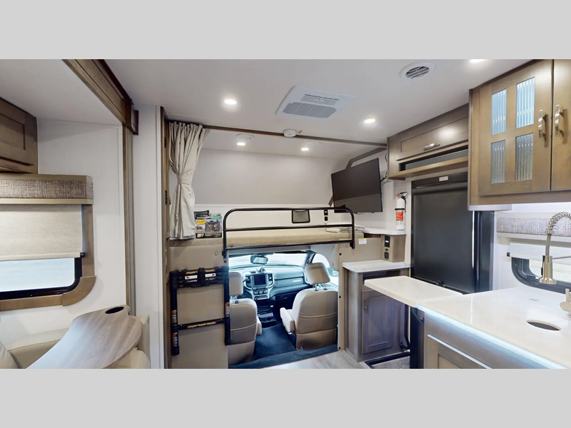 - Front Cab-Over Bunk Area with Mattress (50” x 80”) and Privacy Curtain