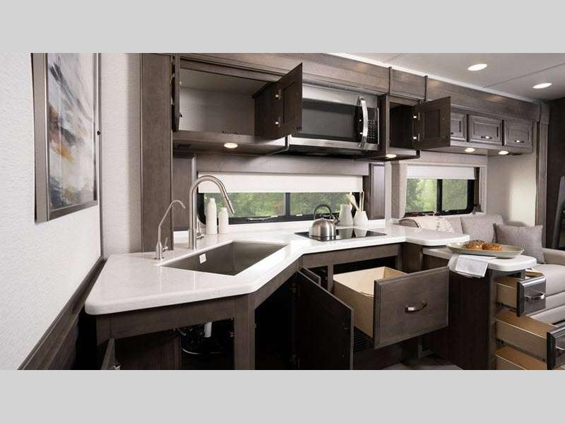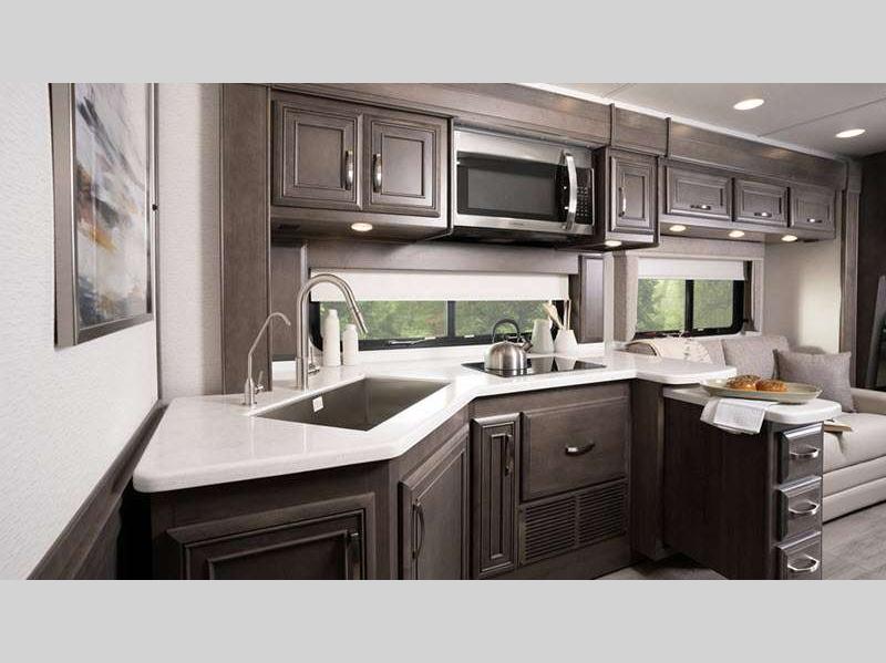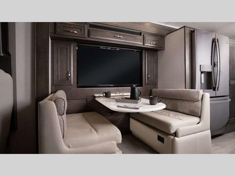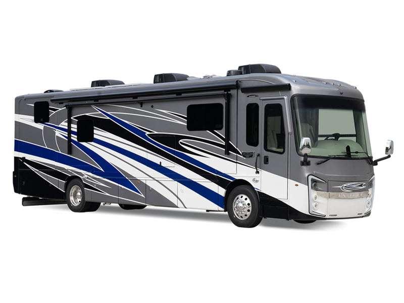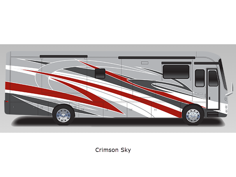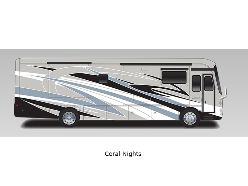 Sleeps 5 Slides 3 Length 39 ft 11 in Ext Width 8 ft 5 in Ext Height 12 ft 10 in Int Height 7 ft Interior Color Glacier, Summit, Valley Exterior Color Blue Dusk, Coral Nights, Crimson Sky, Sand Dunes Hitch Weight 10000 lbs GVWR 36320 lbs Fresh Water Capacity 100 gals Grey Water Capacity 62 gals Black Water Capacity 41 gals Tire Size 275/80R 22.5" Furnace BTU 50000 btu Generator Onan 8,000-watt diesel Fuel Type Diesel Engine Cummins B6.7 Chassis Spartan K1 Horsepower 360 hp Fuel Capacity 100 gals Wheelbase 261 in Available Beds King Power Head Lift Torque 800 ft-lb Refrigerator Type Stainless Steel Residential Convection Cooking Yes Cooktop Burners 2 Shower Size 30" x 40" Number of Awnings 1 Axle Weight Front 14320 lbs Axle Weight Rear 22000 lbs LP Tank Capacity 24.5 gals Water Heater Type Tankless AC BTU 45000 btu TV Info LR 50" Samsung 4K UHD Smart TV, BR 32" LED Smart TV, Ext. 43" Samsung 4K UHD Smart TV Awning Info Carefree Power Patio w/LED Lights Washer/Dryer Available Yes Gross Combined Weight 46320 lbs Shower Type Standard Electrical Service 50 amp Solar Wattage 400 watts Similar Floorplans