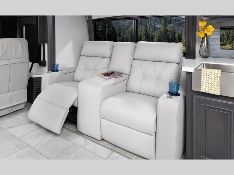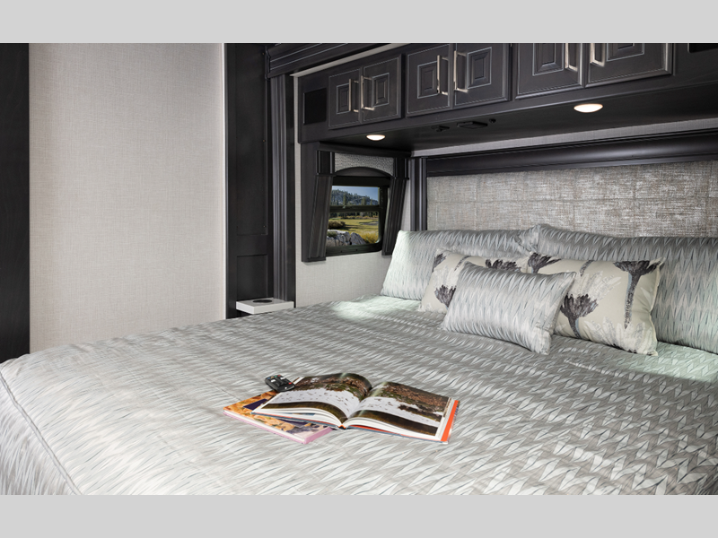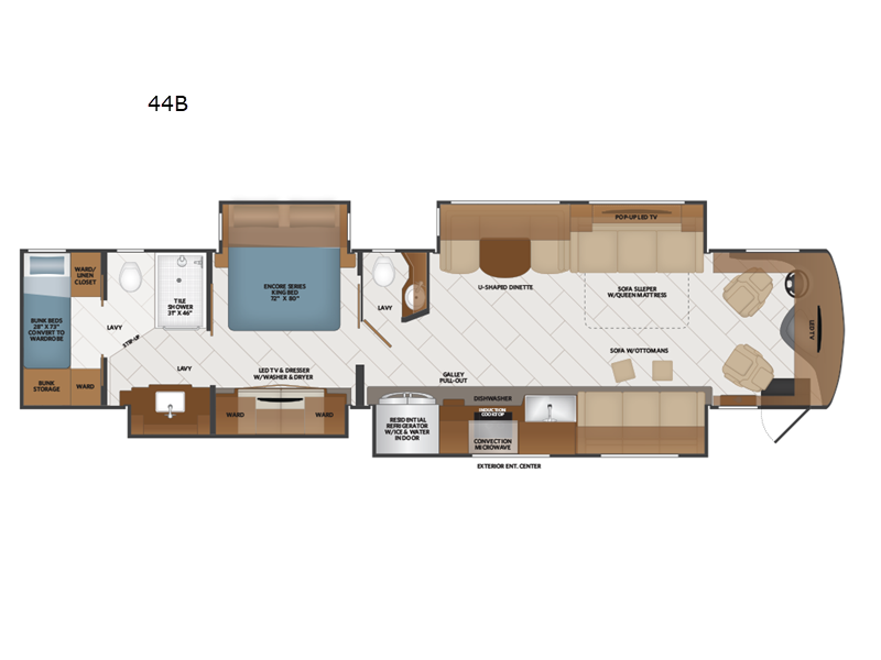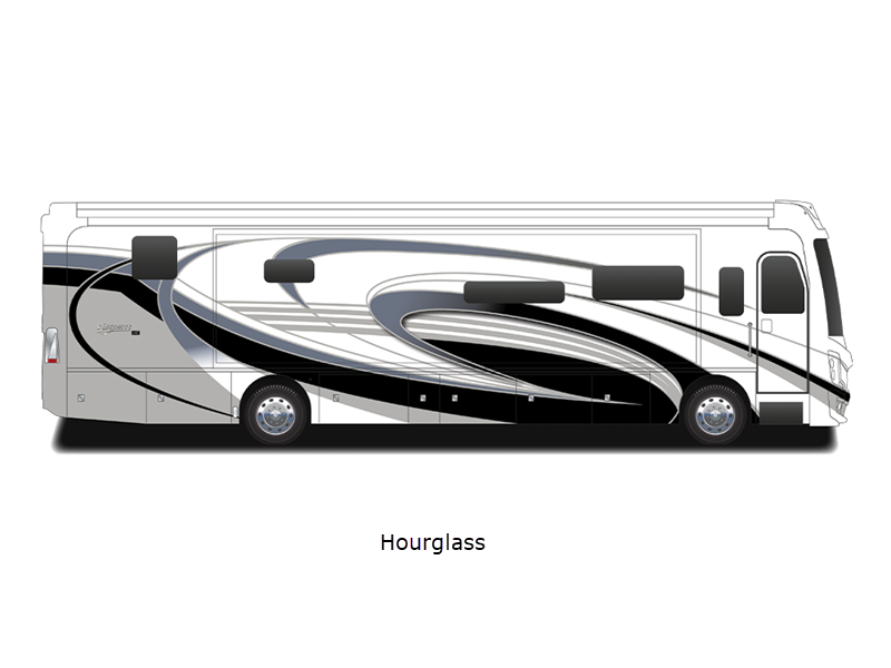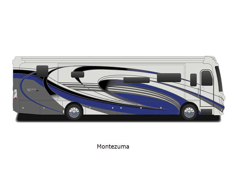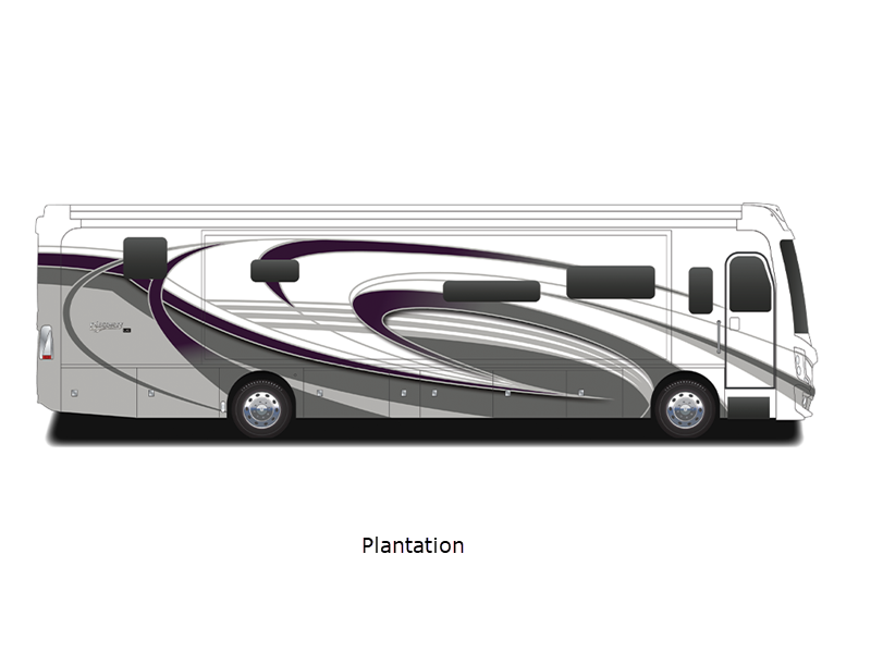 Sleeps 4 Slides 4 Length 44 ft Ext Width 8 ft 6 in Ext Height 12 ft 10 in Int Height 7 ft Interior Color Serenity, Anthology, Signature, Amaretto Exterior Color Carezza, Constellation, Hourglass, Montezuma, Plantation, Rendezvous Hitch Weight 15000 lbs GVWR 43600 lbs Fresh Water Capacity 105 gals Grey Water Capacity 75 gals Black Water Capacity 50 gals Tire Size 275/80R 22.5H Generator 8kw Onan Quiet Diesel Fuel Type Diesel Engine Cummins L9 Chassis Freightliner Custom XCM Horsepower 450 hp Fuel Capacity 100 gals Wheelbase 309 in Available Beds King Torque 1250 ft-lb Refrigerator Type Residential w/Ice and Water In Door Convection Cooking Yes Cooktop Burners 2 Shower Size 34" x 48" Number of Awnings 1 Axle Weight Front 13600 lbs Axle Weight Rear 20000 lbs Axle Weight Tag 10000 lbs Water Heater Type Aqua Hot 400D AC BTU 45000 btu Basement Storage 152 cu. ft. TV Info LR LED TV, Cab LED TV, BR LED TV, Ext. LED TV Awning Info 18' Power w/LED Lighting & Motion Sensor Retract Washer/Dryer Available Yes Gross Combined Weight 58600 lbs Shower Type Shower w/Seat Electrical Service 50 amp Similar Floorplans
