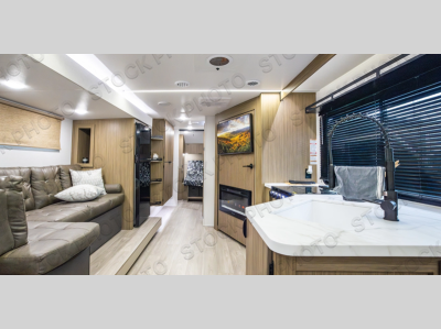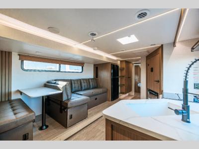 There are stylish window shades inside, along with TFL cabinet doors, upgraded backsplash, plus elegant curtain rods and curtains to make you feel more at home. You will also appreciate some of the best-in-class features such as, an enclosed Accessibelly for added protection, exterior accent lighting, a powder coated I-beam frame, and seamless holding tanks.