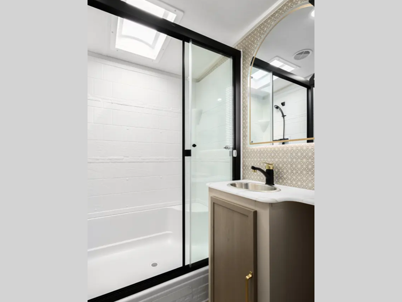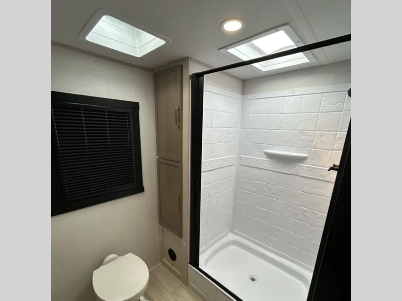 Sleeps 5 Slides 2 Length 33 ft 10 in Ext Width 8 ft Ext Height 11 ft Hitch Weight 1195 lbs Dry Weight 8338 lbs Cargo Capacity 1657 lbs Fresh Water Capacity 57 gals Grey Water Capacity 66 gals Black Water Capacity 30 gals Available Beds Queen with Versa Tilt Refrigerator Type 12V Refrigerator Size 10 cu ft Cooktop Burners 3 Shower Size 30" x 36" Number of Awnings 1 Water Heater Type On Demand Tankless AC BTU 31500 btu TV Info LR 50" LED Smart TV Awning Info 20' with LED Lights Axle Count 2 Washer/Dryer Available Yes Shower Type Walk-In Shower Electrical Service 50 amp Similar Floorplans
