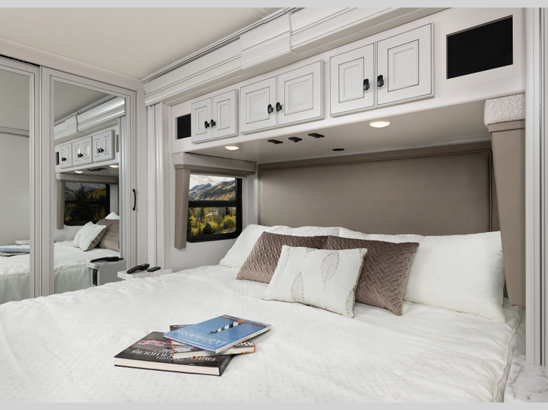 Sleeps 6 Slides 3 Length 35 ft 4 in Ext Width 8 ft 6 in Ext Height 12 ft 10 in Int Height 7 ft Interior Color Altair, Canvas, Metropolis Exterior Color Blackjack, Castaway, Portside, Riptide, Runway, Surge Hitch Weight 10000 lbs Fresh Water Capacity 96 gals Grey Water Capacity 65 gals Black Water Capacity 45 gals Fuel Type Diesel Engine Cummins B6.7 Chassis Freightliner XCR Horsepower 340 hp Fuel Capacity 100 gals Wheelbase 206 in Available Beds King Torque 700 ft-lb Refrigerator Type Residential Convection Cooking Yes Cooktop Burners 2 Shower Size 38" x 30" Axle Weight Front 12600 lbs Axle Weight Rear 20000 lbs Water Heater Type AquaHot 250D Basement Storage 135 cu. ft. TV Info LR LED Smart TV, BR Pop-Up LED TV, Exterior LED TV Awning Info 18' Washer/Dryer Available Yes Gross Combined Weight 33000 lbs Shower Type Shower w/Seat Similar Floorplans