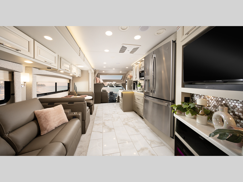 Sleeps 6 Slides 3 Length 39 ft 4 in Ext Width 8 ft 5 in Ext Height 13 ft 4 in Int Height 7 ft Interior Color Fieldstone, Mountain Peak, Saddle Exterior Color Beacon Blue, Breezy Blue, Radiant Silver, Rosy Garnet, Dark Knight Full-Body Paint Choices Hitch Weight 12000 lbs GVWR 31000 lbs Fresh Water Capacity 72 gals Grey Water Capacity 80 gals Black Water Capacity 50 gals Tire Size 275/80R22.5G Generator 8,000W Diesel Fuel Type Diesel Engine Cummins ISB 6.7L Chassis Freightliner S2RV Plus Horsepower 360 hp Fuel Capacity 100 gals Wheelbase 279 in Number Of Bunks 1 Available Beds King Torque 800 ft-lb Refrigerator Type Stainless Steel Residential Convection Cooking Yes Cooktop Burners 2 Shower Size 30" x 36" Number of Awnings 1 Water Heater Type Aqua Hot 250D Hydronic AC BTU 30000 btu Basement Storage 152 cu. ft. TV Info LR 50" LED TV, BR 32" LED TV, Exterior LED TV Awning Info 19' 8" Roof-Mounted Girard w/LED Lights Washer/Dryer Available Yes Gross Combined Weight 43000 lbs Shower Type Standard Electrical Service 50 amp Solar Wattage 200 watts Similar Floorplans