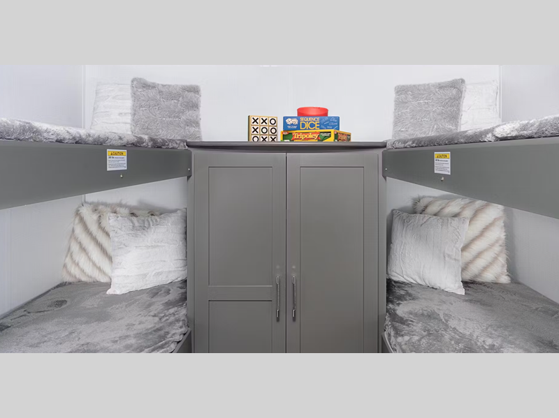 Sleeps 9 Slides 1 Interior Color Tranquil Timber Furnace BTU 30000 btu Number Of Bunks 4 Available Beds Queen Refrigerator Type 12V Refrigerator Size 8 cu ft Cooktop Burners 2 Number of Awnings 1 LP Tank Capacity 20 lbs Water Heater Type Tankless AC BTU 13500 btu Awning Info 17' Axle Count 1 Number of LP Tanks 2 Shower Type Standard Similar Floorplans