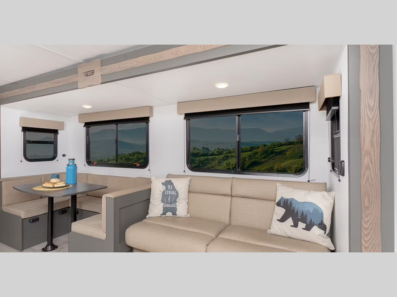 Sleeps 8 Slides 1 Length 32 ft 9 in Ext Height 10 ft 11 in Interior Color Tranquil Timber Hitch Weight 765 lbs Dry Weight 5950 lbs Cargo Capacity 1850 lbs Fresh Water Capacity 37 gals Grey Water Capacity 60 gals Black Water Capacity 30 gals Furnace BTU 30000 btu Number Of Bunks 2 Available Beds Queen Refrigerator Type 12V Refrigerator Size 8 cu ft Cooktop Burners 2 Number of Awnings 1 LP Tank Capacity 20 lbs Water Heater Type Tankless AC BTU 15000 btu Number of LP Tanks 2 Shower Type Standard Similar Floorplans