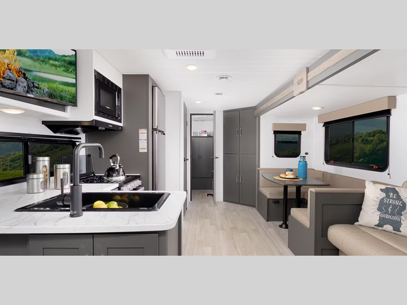 Sleeps 3 Slides 1 Length 22 ft 11 in Ext Height 10 ft 9 in Interior Color Tranquil Timber Hitch Weight 520 lbs Dry Weight 4440 lbs Cargo Capacity 2060 lbs Fresh Water Capacity 37 gals Grey Water Capacity 30 gals Black Water Capacity 30 gals Furnace BTU 30000 btu Available Beds Queen Refrigerator Type 12V Refrigerator Size 8 cu ft Cooktop Burners 2 Number of Awnings 1 LP Tank Capacity 20 lbs Water Heater Type Tankless AC BTU 13500 btu Axle Count 2 Number of LP Tanks 2 Shower Type Standard Similar Floorplans