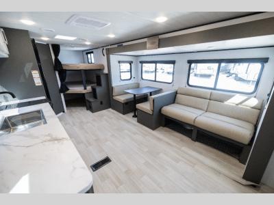 This travel trailer is designed for discerning families who crave adventure! The double-sized bunks provides a snug and inviting sleeping spot for kids, while the immaculately appointed full bathroom is thoughtfully designed for a refreshing stay. The kitchen is equipped with a generous pantry for storing gourmet ingredients, a high-performance refrigerator for keeping drinks and meals perfectly chilled, a rapid-cooking microwave, and a precision-crafted two-burner cooktop for preparing exquisite meals. Expansive overhead cabinets provide ample storage for fine china and cookware. The stylish booth dinette provides an intimate and convivial spot for meals and snacks, while the plush jackknife sofa offers a comfortable seating area that can be converted into a luxurious sleeping space. And after a long day in the woods, rest in the private front bedroom featuring a sumptuous queen-sized bed with a convenient nightstand and spacious dual wardrobes on each side.