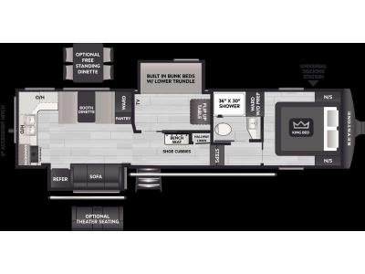 Sleeps 7 Slides 2 Length 33 ft 11 in Ext Height 12 ft 8 in Interior Color Umber Luxe Hitch Weight 1635 lbs Dry Weight 9235 lbs Cargo Capacity 2265 lbs Fresh Water Capacity 54 gals Grey Water Capacity 60 gals Black Water Capacity 30 gals Tire Size ST225/75R15E Furnace BTU 30000 btu Number Of Bunks 2 Available Beds King Refrigerator Type 12V Refrigerator Size 10.4 cu ft Cooktop Burners 3 Shower Size 36" x 30" Number of Awnings 2 LP Tank Capacity 30 lbs Water Heater Type On Demand AC BTU 18000 btu TV Info LR LED HDTV Awning Info 7' and 15' Electric w/Gas Strut Arm w/Dotless Neon LED Lighting Axle Count 2 Washer/Dryer Available Yes Number of LP Tanks 2 Shower Type Standard Electrical Service 50 amp Similar Fifth Wheel Floorplans