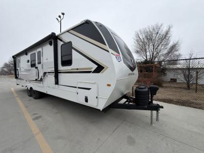 With dual entry doors in this travel trailer, you can enter in through the main living area or the full bath for convenience! Once inside, the sleeper sofa and booth dinette provide places to relax, eat, and play games, plus there is an entertainment center with hidden storage behind to keep movies organized. A full kitchen with a three burner cooktop and 12V refrigerator will allow you to cook and store food, or you can head outdoors to cook on the outdoor kitchen. There is also drop-frame storage outside for fishing poles and hiking gear, and the 21' electric awning provides shade as you relax. When it's time to call it a night, the king bed in the front private bedroom is sure to bring comfort, while the little ones take the double-size bunks, and any other guests can sleep on the living room furniture!