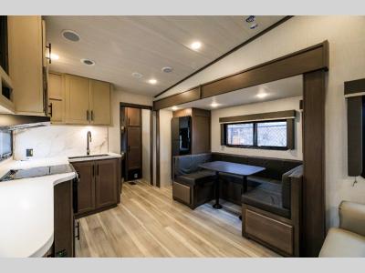 Sleeps 10 Slides 1 Length 31 ft 11 in Ext Height 12 ft 7 in Interior Color Umber Luxe Hitch Weight 1390 lbs Dry Weight 7646 lbs Cargo Capacity 1854 lbs Fresh Water Capacity 54 gals Grey Water Capacity 60 gals Black Water Capacity 30 gals Tire Size ST225/75R15E Number Of Bunks 3 Available Beds Queen Refrigerator Type 12 Volt Refrigerator Size 10.4 cu ft Cooktop Burners 3 Number of Awnings 1 LP Tank Capacity 30 lbs. Water Heater Type Girard Tankless On Demand AC BTU 15000 btu TV Info LR 40" LED TV Awning Info 20' Electric w/ Gas Strut Arm and Dotless Neon Style LED Lighting Axle Count 2 Number of LP Tanks 2 Shower Type Standard Electrical Service 50 amp Similar Fifth Wheel Floorplans