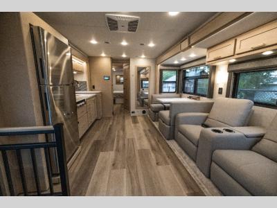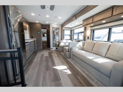 Sleeps 9 Slides 3 Length 39 ft 2 in Ext Width 8 ft 4 in Ext Height 12 ft 10 in Int Height 7 ft Interior Color Augusta, Bellport, Wilmington Exterior Color Atmos, Ion, Luminance, Recharge, Polaris, Tundra, Atlas LR, Mojave Hitch Weight 12000 lbs GVWR 35000 lbs Fresh Water Capacity 150 gals Grey Water Capacity 75 gals Black Water Capacity 75 gals Tire Size 295/75R22.5" Furnace BTU 35000 btu Generator 8kW Onan Quiet Diesel Fuel Type Diesel Engine Cummins ISB 6.7L Chassis Freightliner S2RV Horsepower 360 hp Fuel Capacity 100 gals Wheelbase 279 in Number Of Bunks 3 Available Beds Mini-King Torque 800 ft-lb Refrigerator Type Residential Stainless Steel with Icemaker Refrigerator Size 18 cu ft Convection Cooking Yes Cooktop Burners 3 Number of Awnings 1 LP Tank Capacity 20.3 gals Water Heater Type Truma Comfort Plus Tankless AC BTU 30000 btu TV Info Smart LED TV; LR 42", BR 32", Ext. 32" Awning Info Electric Girard GG Lateral Arm with LED Lights Washer/Dryer Available Yes Shower Type Radius Electrical Service 50 amp Similar Motor Home Super C - Diesel Floorplans