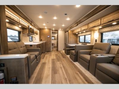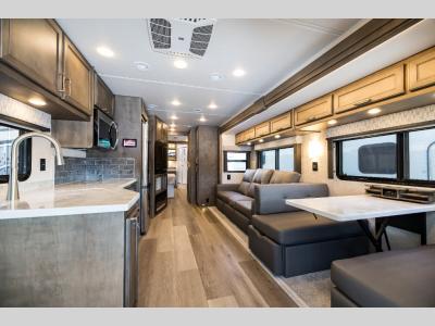 Each is built with aerodynamic fiberglass front and rear caps in two-pieces for easy replacement, a crowned fiberglass roof surface, and includes "Super Sandwich" floor construction with galvanized vapor barrier. The beautiful interior gives you luxury throughout with beautiful maple hardwood cabinets with soft closing drawers topped with solid surface countertops, stainless steel appliances, a French door refrigerator, and Ultra-Soft furniture. And the entertainment and electrical systems are something to boast about!