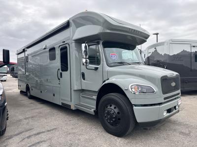 Sleeps 6 Slides 2 Length 36 ft 8 in Ext Width 8 ft 4 in Ext Height 12 ft 10 in Int Height 7 ft Interior Color Athens, Cyprus, Tuscany Exterior Color Flare, Kinetic, Propulsion, Surge, Polaris, Tundra, Atlas LR, Mojave Hitch Weight 20000 lbs GVWR 37600 lbs Fresh Water Capacity 150 gals Grey Water Capacity 75 gals Black Water Capacity 75 gals Generator 8 KW Onan Quiet Diesel Fuel Type Diesel Engine Cummins L9 Chassis Freightliner M2-106 Plus Horsepower 360 hp Fuel Capacity 100 gals Wheelbase 285 in Available Beds Mini King Torque 1150 ft-lb Refrigerator Type Stainless Steel French Door Residential Refrigerator Size 18 cu ft Convection Cooking Yes Cooktop Burners 2 Number of Awnings 1 Water Heater Type AquaHot 450D AC BTU 30000 btu TV Info LR 43" 4K Smart LED, BR 32" 4K Smart LED, Ext. 32" LED Awning Info Electric Lateral Arm w/LED Lights Washer/Dryer Available Yes Shower Type Radius Electrical Service 50 amp Similar Motor Home Super C - Diesel Floorplans