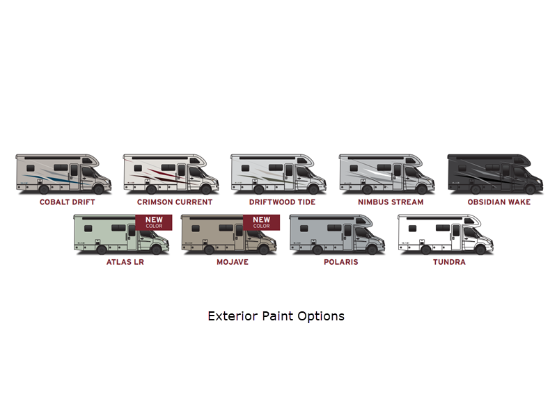 Sleeps 4 Slides 1 Length 25 ft 6 in Ext Width 7 ft 9 in Ext Height 11 ft 4 in Int Height 7 ft Interior Color Oak Bluffs, Seabrooke Exterior Color Cobalt Drift, Crimson Current, Driftwood Tide, Nimbus Stream, Obsidian Wake, Atlas LR, Mojave, Polaris, Tundra Fresh Water Capacity 34 gals Grey Water Capacity 29 gals Black Water Capacity 29 gals Furnace BTU 18000 btu Generator 3.6kW Onan LP Fuel Type Diesel Engine 4-Cylinder Dual Turbo Diesel Chassis Mercedes-Benz Sprinter 4500 Cab Horsepower 208 hp Fuel Capacity 24.5 gals Wheelbase 170 in Number Of Bunks 1 Available Beds RV Queen Torque 332 ft-lb Refrigerator Type 12V Refrigerator Size 8 cu ft Convection Cooking Yes Cooktop Burners 2 Shower Size 36" x 24" Axle Weight Front 4410 lbs Axle Weight Rear 7720 lbs LP Tank Capacity 20.3 gals. Water Heater Type GE Tankless AC BTU 15000 btu TV Info Smart LED TV; LR, Ext. Awning Info Powered Girard GG Lateral Arm w/LED Lights and Slide Toppers Gross Combined Weight 15250 lbs Shower Type Standard Solar Wattage 200 watts Similar Floorplans