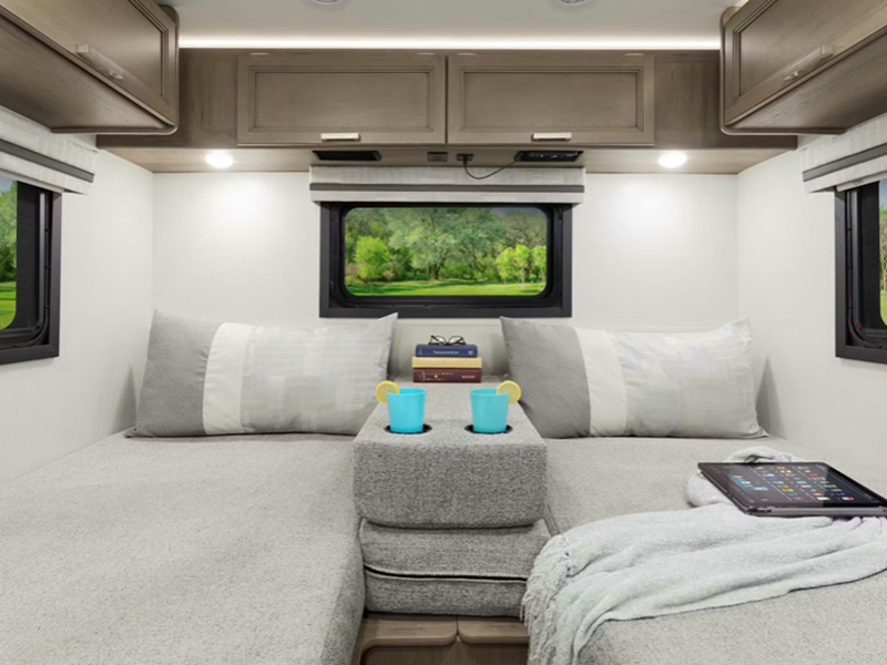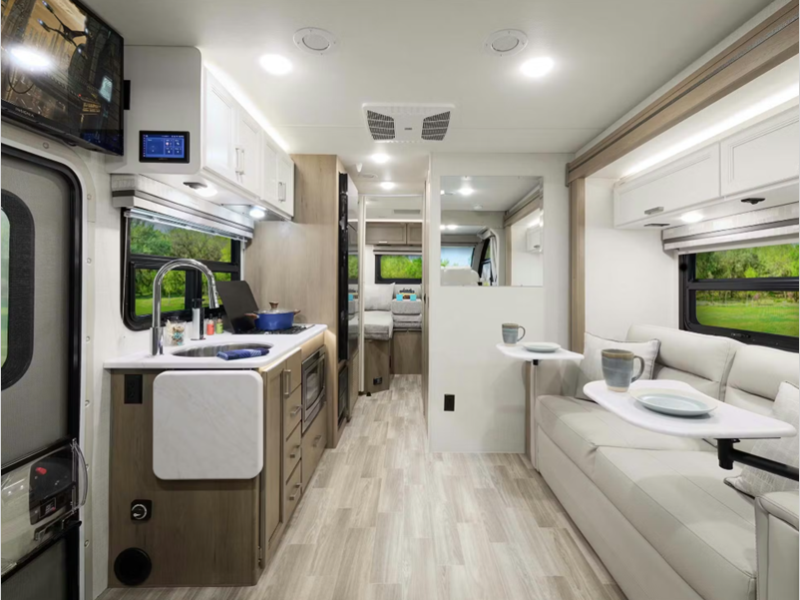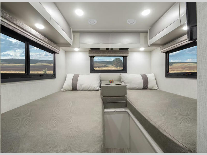 The 14" touchscreen dash radio in the cab comes with Bluetooth, Android Auto, and Apple CarPlay, and it is ready for SiriusXM radio. The reclining/swivel leatherette captain's chairs are super comfortable, and they can even serve as an additional lounge spot for the rest of the living area when you swivel them around. The Vegas kitchen is ready to help you make meals on the go, and you will find the 12V double-door refrigerator, two-burner gas cooktop, and convection microwave to be quite useful. You will also appreciate the durable premium one-piece domed roof membrane, the 15,000 BTU A/C, and the tankless water heater for endless hot water when you need it.