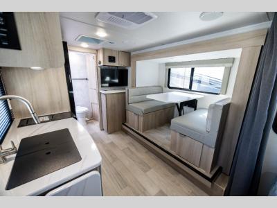 Pack your bags and head to the campground with this travel trailer! You will love all that it has to offer from the full rear bathroom to the front 60" x 74" RV queen-size bed with dual wardrobes on either side of the bed. The 44" x 72" booth dinette slide is not only a great place to enjoy your meals at or play card games, but it can also be transformed into an extra sleeping space if you want to bring along a guest. When you don't feel like making dinner, you can easily pop in some leftovers or a bag of popcorn into the convection microwave and relax while you watch a movie on the Smart TV!