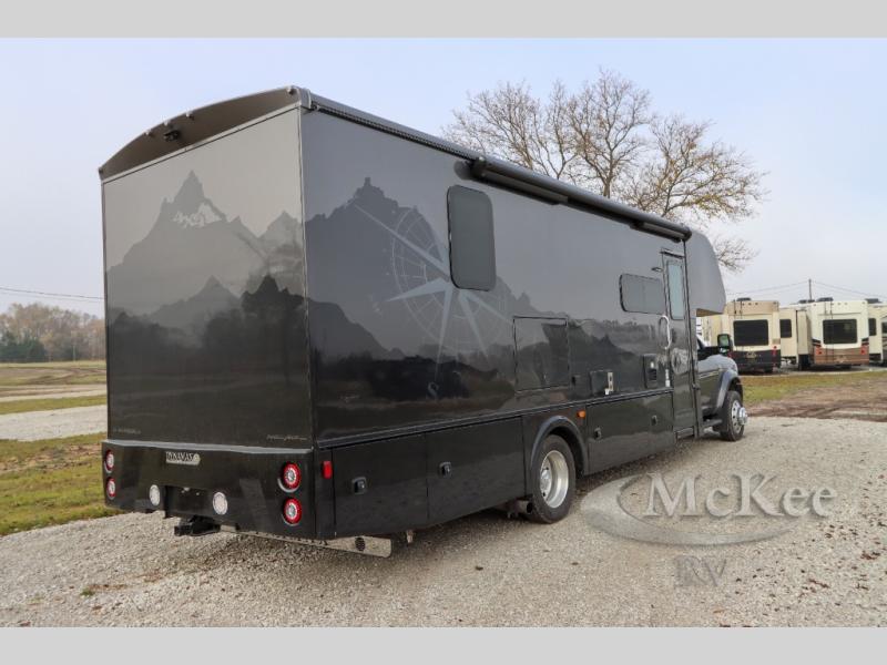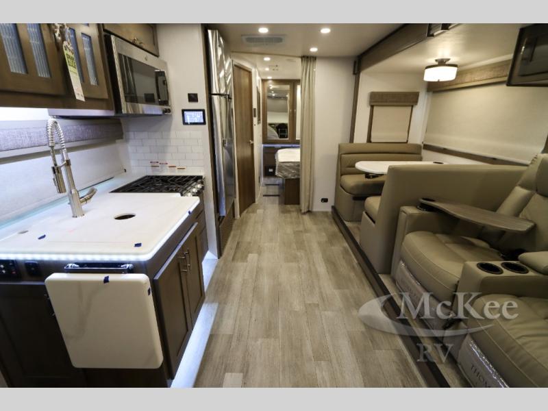 You will have plenty of space to walk about this motorhome with the dual slides! The booth dinette and sofa slide create an open concept living area and the sofa can be replaced for the optional theater seating if you prefer that instead. Freshen up after a long day of traveling in the rear corner bathroom with the designer shower that has a skylight above for more natural lighting and an Oxygenics body spa RV shower head for a more relaxing shower. Put on your comfy clothes stored in the wardrobe in the rear corner private bedroom then either lay on the 60" x 75" gel-infused memory foam mattress while you watch a movie on the 32" LED smart TV or head to the kitchen and whip up a meal with the three burner gas range and countertop extension. You could even head outside and watch a movie on the exterior 32" TV underneath the 16' dual-pitch armless awning!