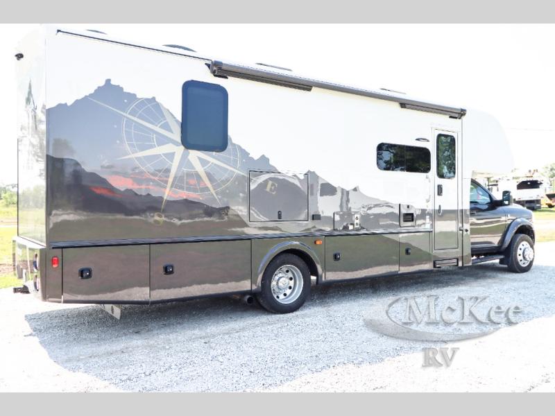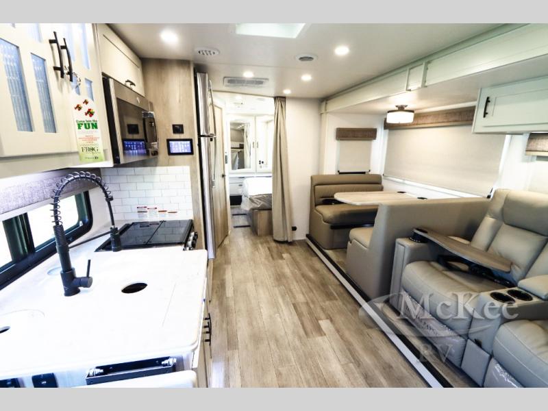 You will have plenty of space to walk about this motorhome with the dual slides! The booth dinette and sofa slide create an open concept living area and the sofa can be replaced for the optional theater seating if you prefer that instead. Freshen up after a long day of traveling in the rear corner bathroom with the designer shower that has a skylight above for more natural lighting and an Oxygenics body spa RV shower head for a more relaxing shower. Put on your comfy clothes stored in the wardrobe in the rear corner private bedroom then either lay on the 60" x 75" gel-infused memory foam mattress while you watch a movie on the 32" LED smart TV or head to the kitchen and whip up a meal with the three burner gas range and countertop extension. You could even head outside and watch a movie on the exterior 32" TV underneath the 16' dual-pitch armless awning!