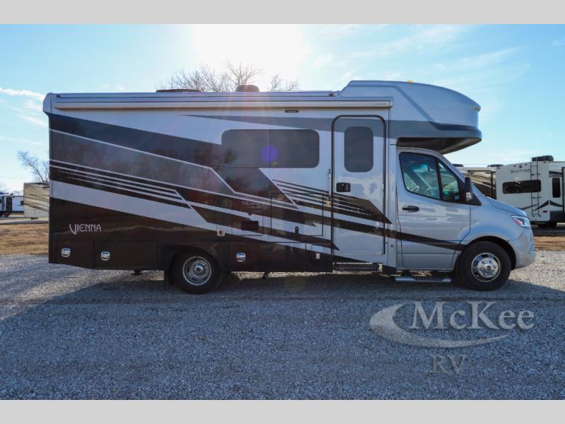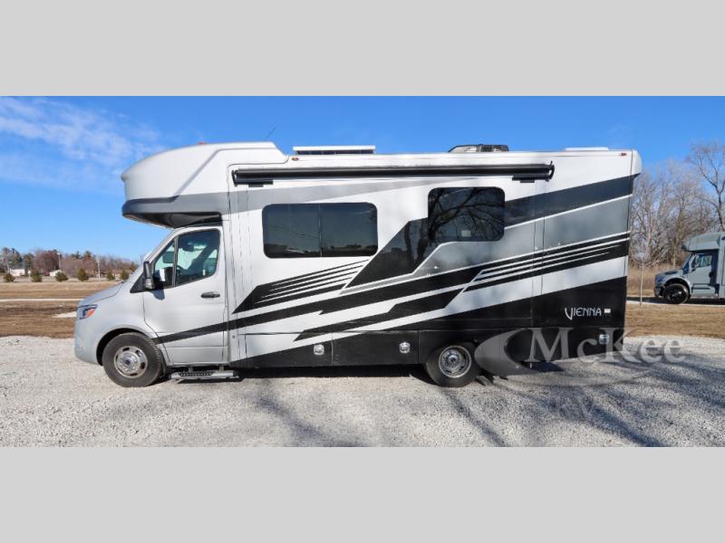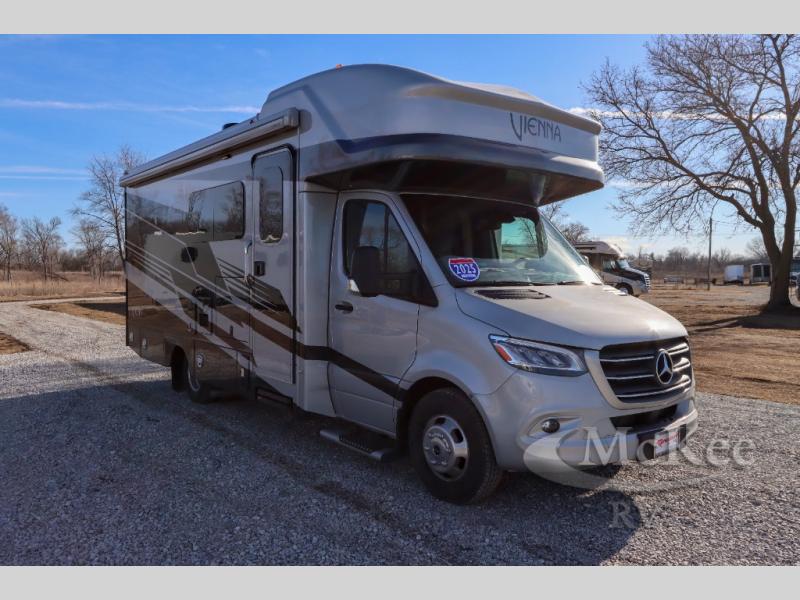 Luxury is in the details of each one of these Renegade Vienna Class C diesel motorhomes! They are built on a Mercedes-Benz Sprinter chassis, and include a four point hydraulic leveling system with app control, a 2000w true sine wave hybrid inverter, a 3.6KW LP generator with auto gen start, and Winegard Connect 2.0. You will appreciate the Truma™ Comfort Plus tankless water heater when showering, the accent lighting at the galley countertop for style, and the USB charging in the living area, bedroom and kitchen to keep your electronics ready. The Maple hardwood cabinetry completes the luxurious décor throughout the inside. Make your selection today!