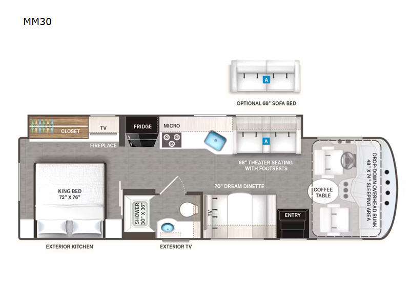 The Luminate MM30 Class A gas motorhome is super spacious featuring a full wall slide along the roadside, and with the drop-down overhead bunk easily sleeps four! There is a 68" theater seat with footrests for two within the full-wall slide for movie night and a Dream Dinette opposite for dining and games. You will also love the rear master bedroom which features a spacious king bed and plenty of storage, plus a 32" TV above a fireplace. When it comes to cooking, you can choose from the fully equipped kitchen with three-burner gas cooktop and oven, convection microwave, and residential refrigerator. Or, you can step outside and cook in the fresh air at the exterior kitchen. You can even enjoy the 32" exterior TV while you're out there!