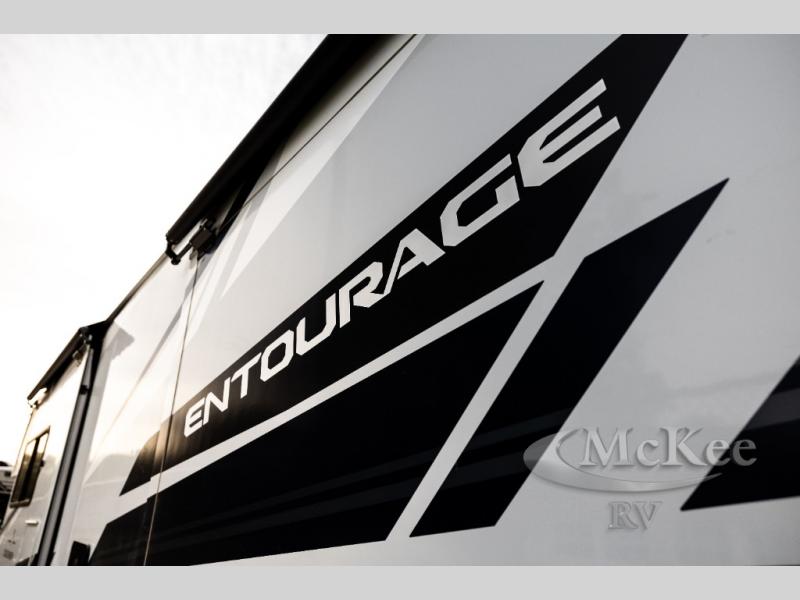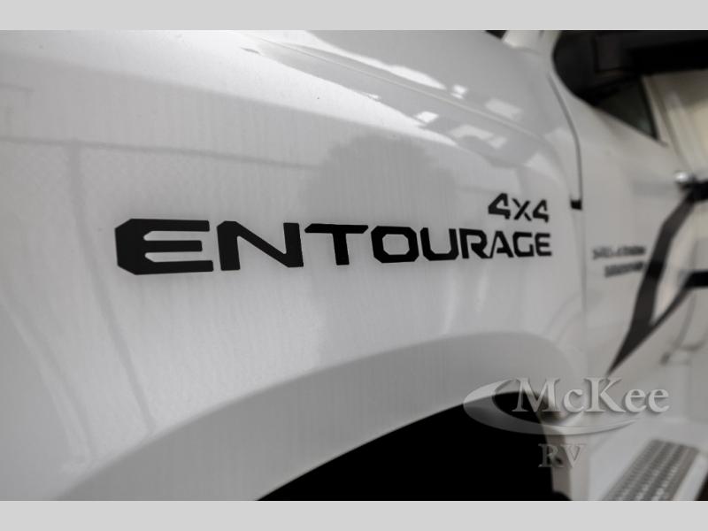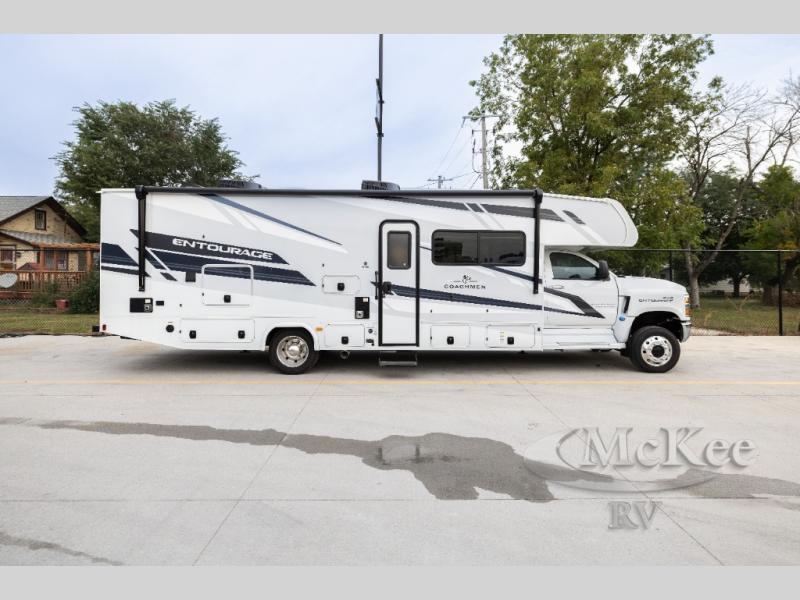 The Entourage is Coachmen's first super C diesel motorhome and it is packed with upscale appointments and solid construction so you can enjoy the RV lifestyle for years to come. This coach features a 4x4 diesel chassis (either a Chevy Silverado 5500 with a V8 6.6L diesel engine, or International CV chassis, depending on the model you choose), plus 50 amp service and a 2,000 watt inverter for all your power needs. The mandatory Icon Package includes a porcelain macerator toilet, auto generator start with dual batteries, 50 amp service, a tankless water heater, and more!
