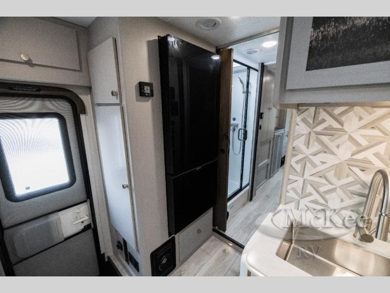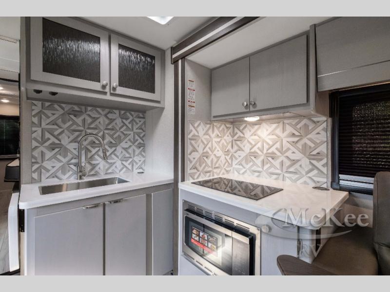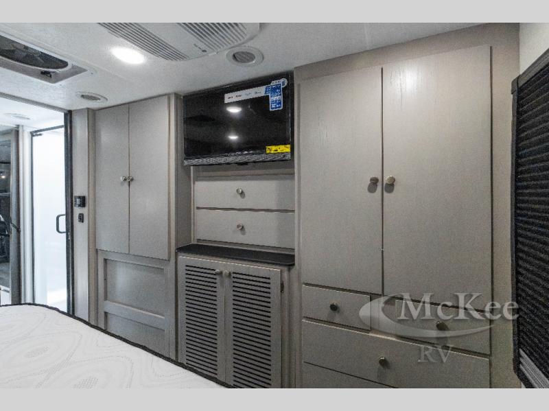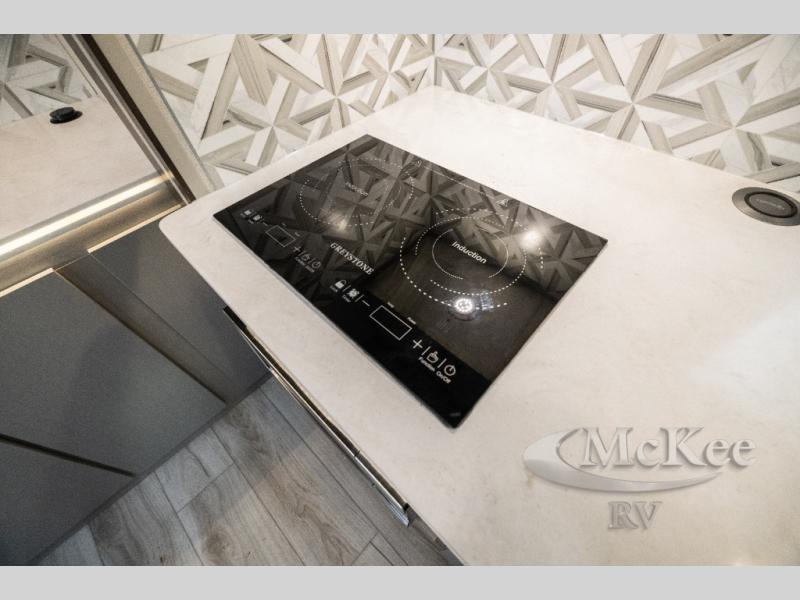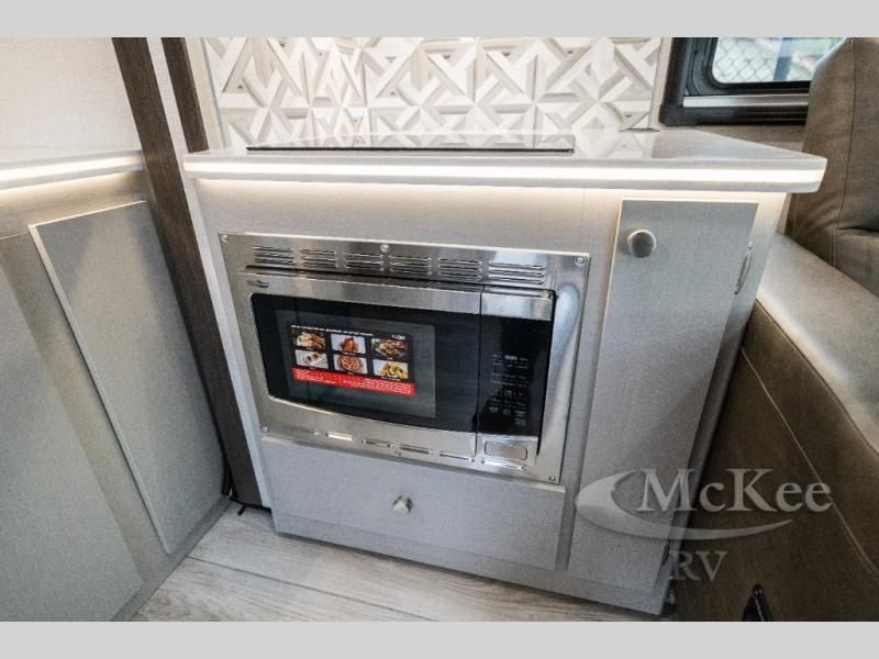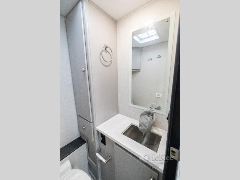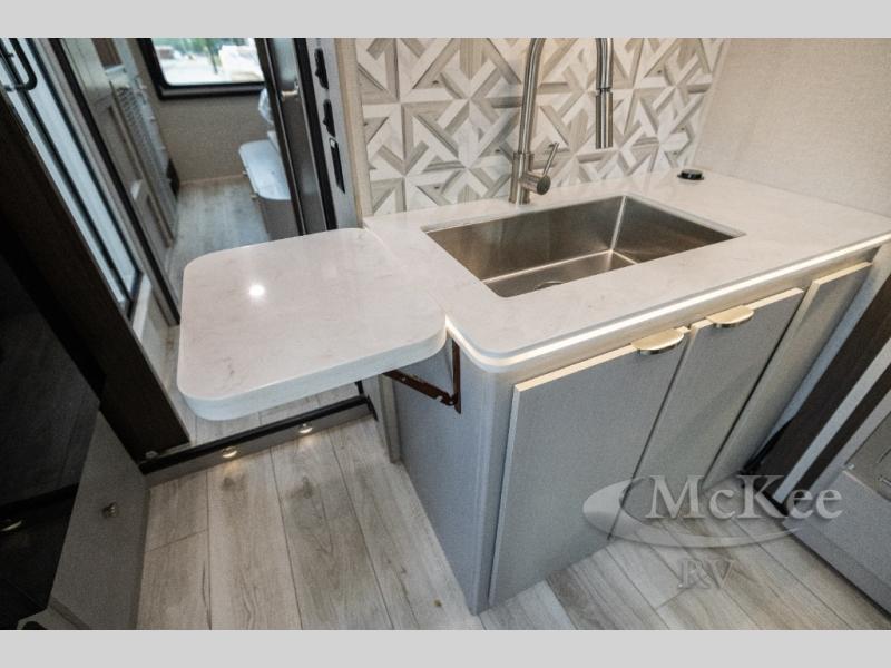 This coach will meet your every need, whether you're a weekend warrior or full-time RVer. Once you arrive at the campground, make a quick lunch on the cooktop or in the convection microwave, and the countertop extension will provide more space to prep fresh veggies. There is a refrigerator and a pantry to store food for the week, plus overhead cabinets for spices and dishes. After lunch is cleaned up, you can relax around the J-lounge with a pedestal table and an extension to sit more people. There is also a slide with theater seating for more seating space This coach features a split-style bath with an independent shower and a private toilet and sink right across the hall so two people can freshen up at once. The rear private bedroom includes a power inclining king bed, dual wardrobes, a TV, plus washer and dryer prep to make wash day easier than ever.