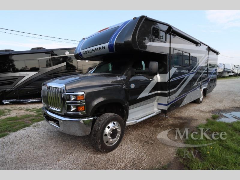 The Entourage is Coachmen's first super C diesel motorhome and it is packed with upscale appointments and solid construction so you can enjoy the RV lifestyle for years to come. This coach features a 4x4 diesel chassis (either a Chevy Silverado 5500 with a V8 6.6L diesel engine, or International CV chassis, depending on the model you choose), plus 50 amp service and a 2,000 watt inverter for all your power needs. The mandatory Icon Package includes a porcelain macerator toilet, auto generator start with dual batteries, 50 amp service, a tankless water heater, and more!