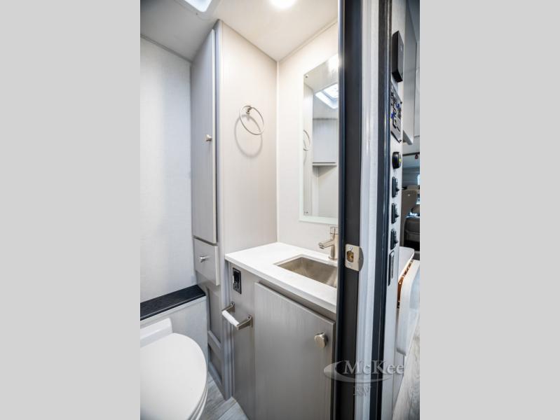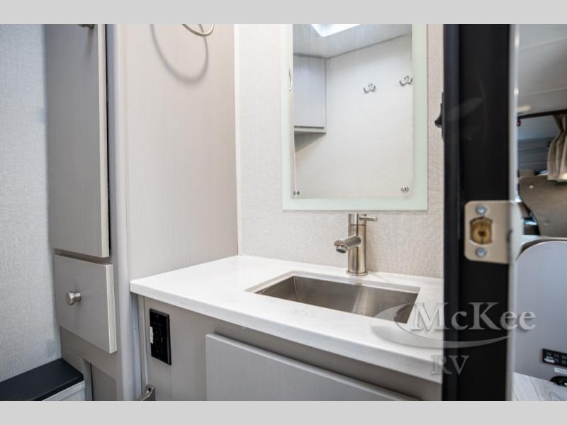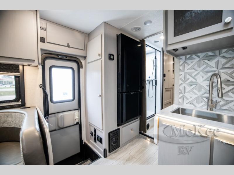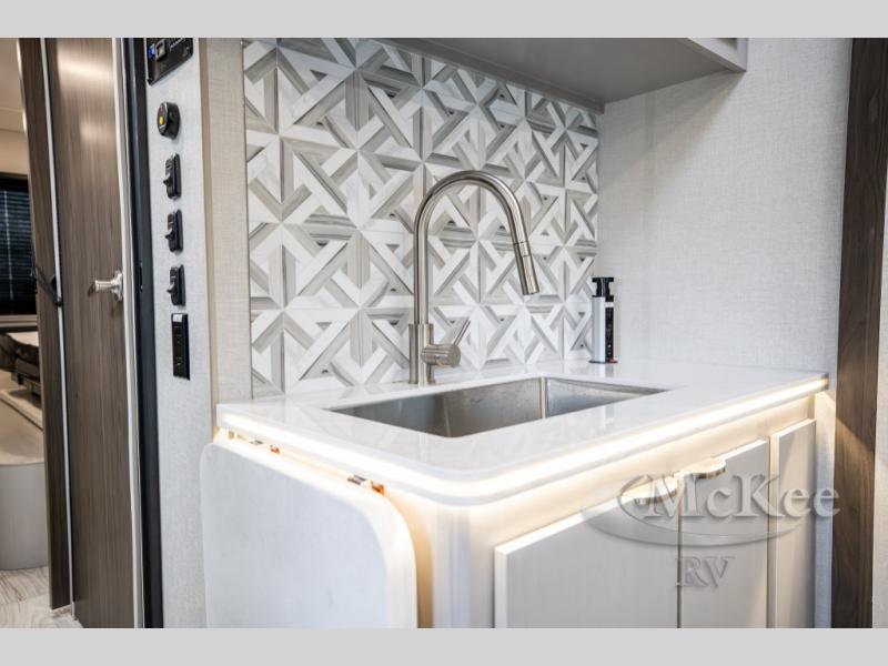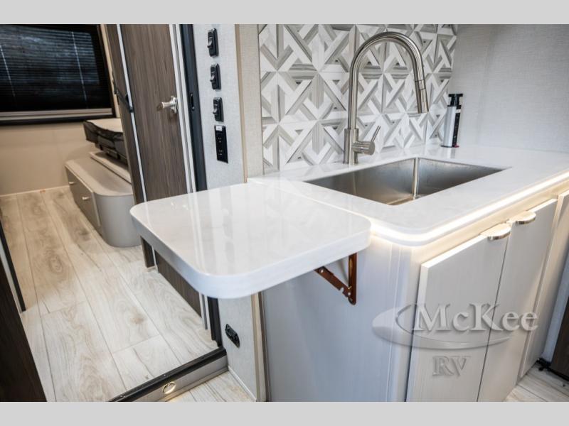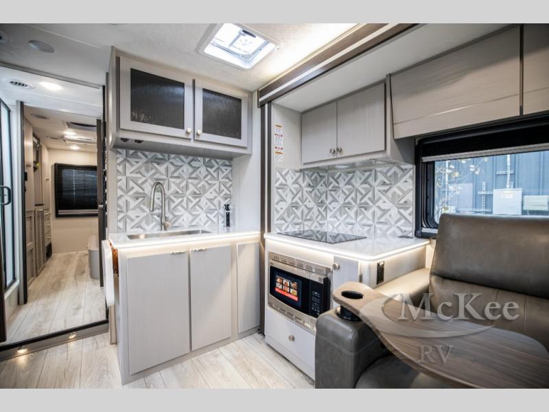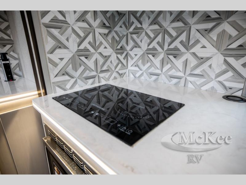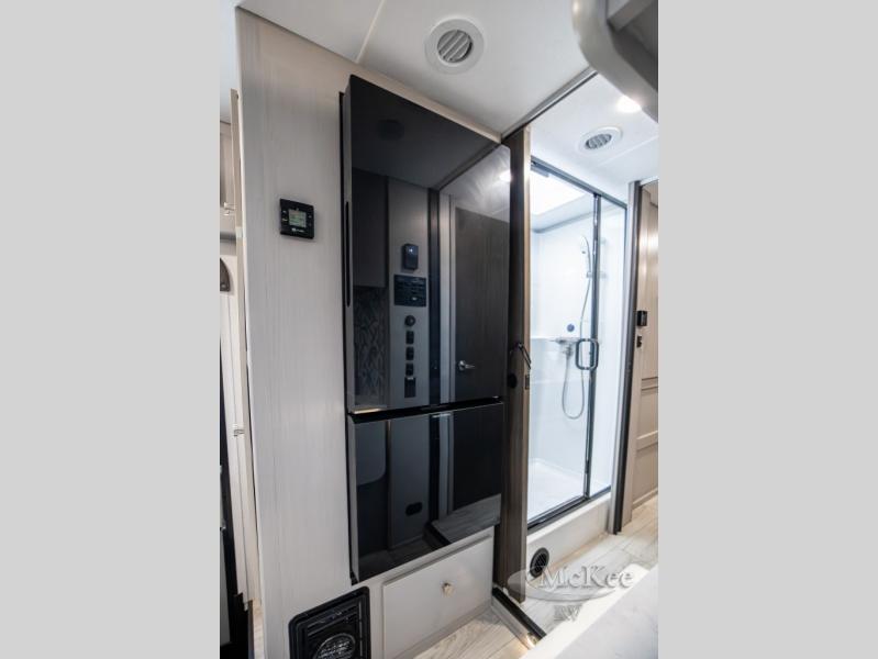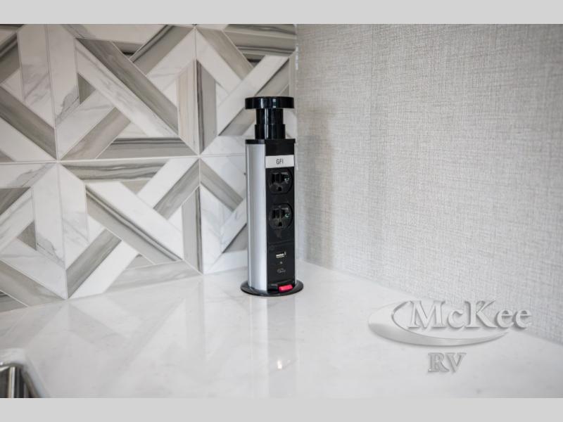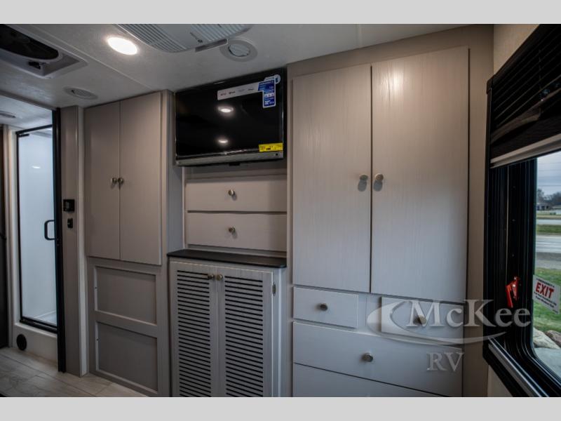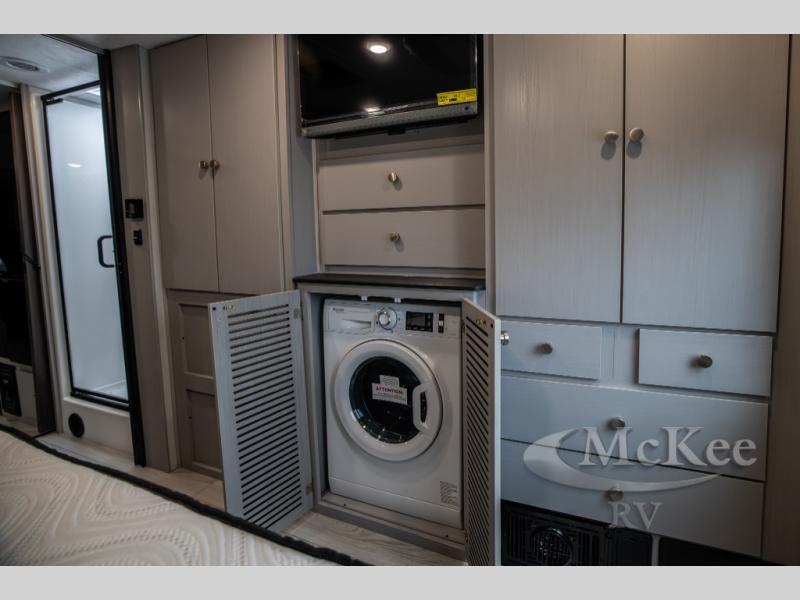 This coach will meet your every need, whether you're a weekend warrior or full-time RVer. Once you arrive at the campground, make a quick lunch on the cooktop or in the convection microwave, and the countertop extension will provide more space to prep fresh veggies. There is a refrigerator and a pantry to store food for the week, plus overhead cabinets for spices and dishes. After lunch is cleaned up, you can relax around the J-lounge with a pedestal table and an extension to sit more people. There is also a slide with theater seating for more seating space This coach features a split-style bath with an independent shower and a private toilet and sink right across the hall so two people can freshen up at once. The rear private bedroom includes a power inclining king bed, dual wardrobes, a TV, plus washer and dryer prep to make wash day easier than ever.
