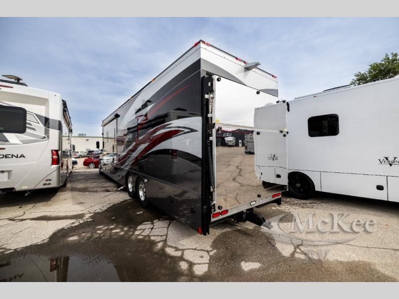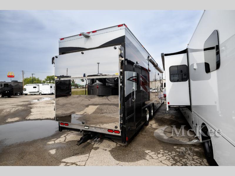 Inside, the 2410AG combines luxurious living with versatile cargo space, perfect for hauling motorcycles, ATVs, or other toys without compromising comfort. Its spacious interior features premium finishes, high-end appliances, and smart design touches that make every journey a pleasure. The rear garage area converts seamlessly into extra living or sleeping space, giving you ultimate flexibility for travel and recreation.